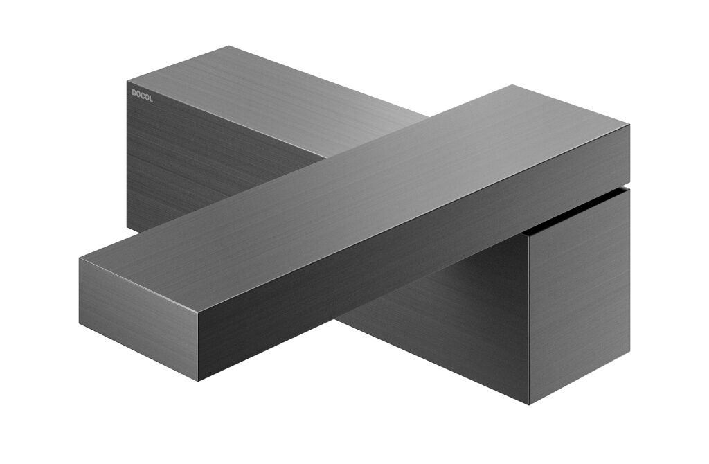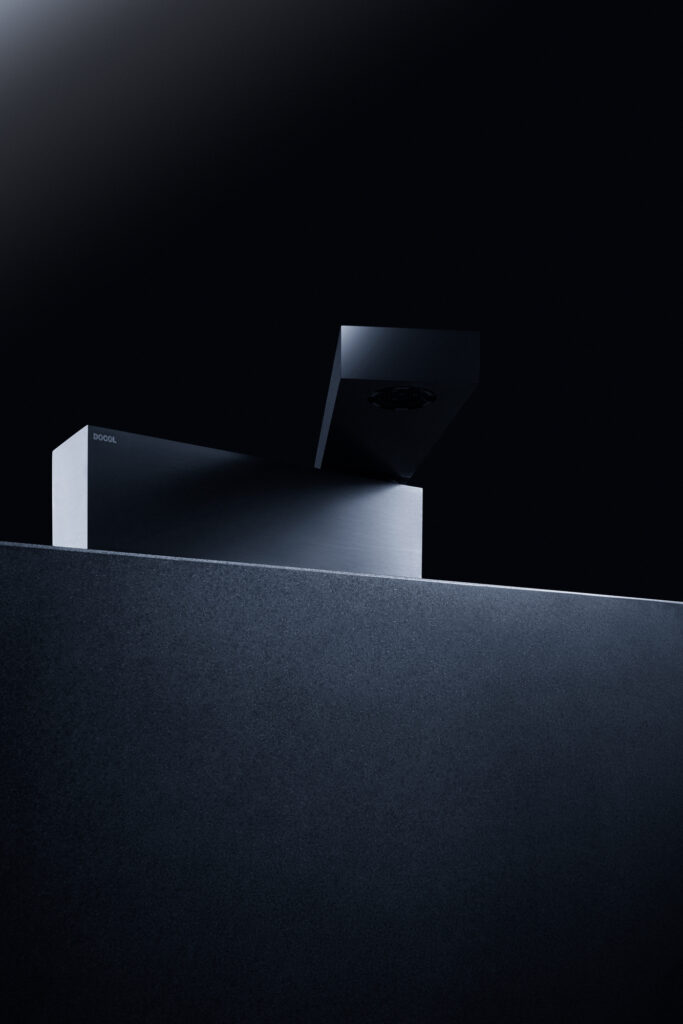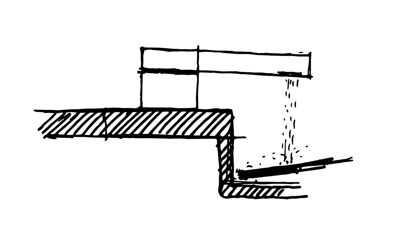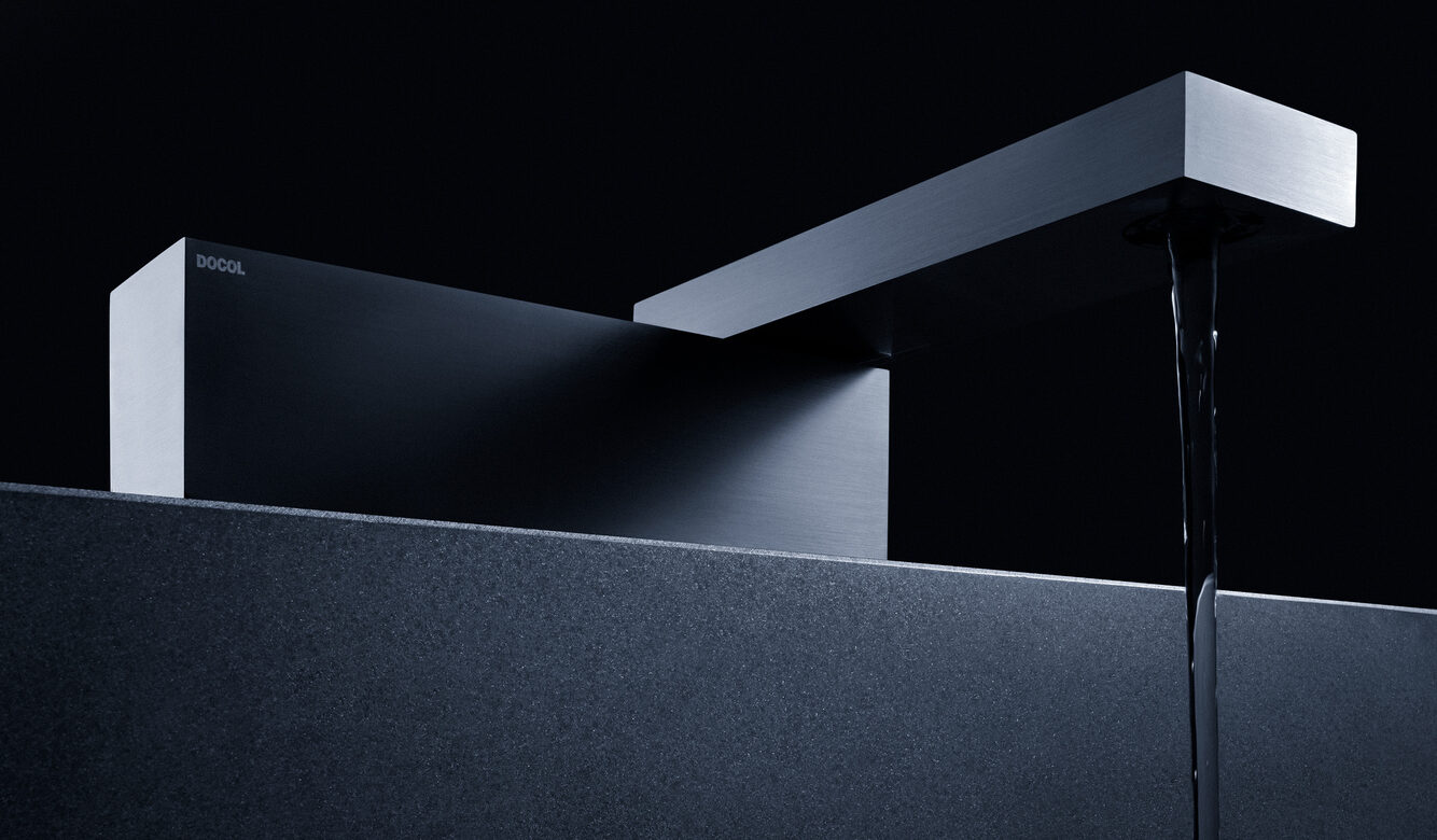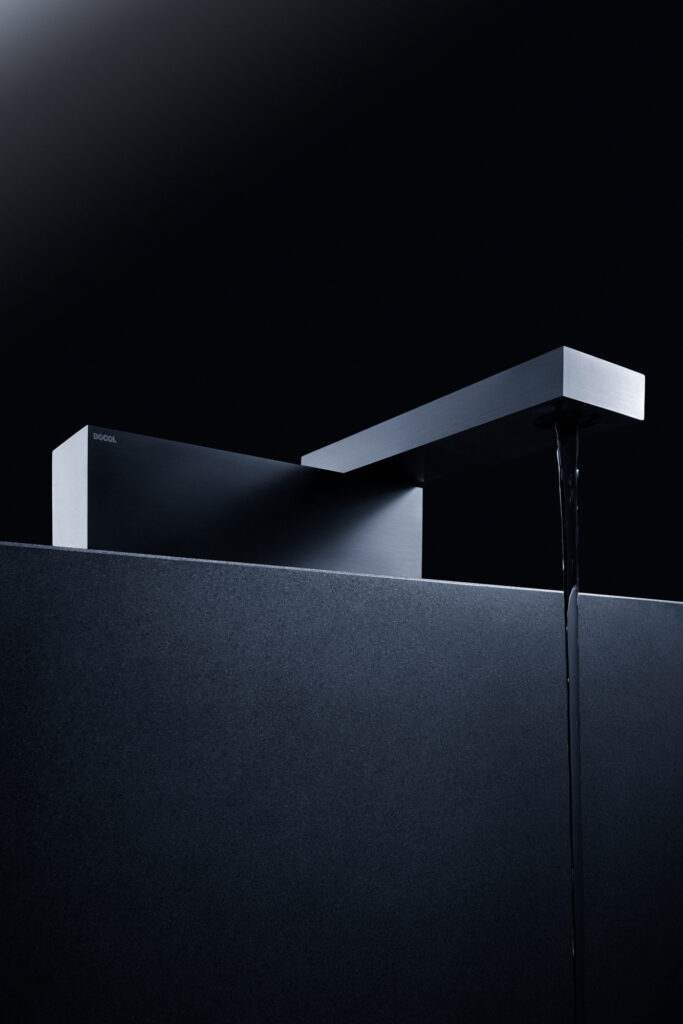 Sendo assim, a ideia deste desenho parte de uma desconstrução do objeto, formado a partir de um desejo de simplificação máxima da forma, a qual é, ao fim, um monolito preto escovado, um pequeno pavilhão que, implantado em uma bancada, pudesse brincar com o imaginário das pessoas. Sutilmente seccionado, o bloco possui um eixo articulador em uma das suas extremidades que permite o movimento e a consequente surpresa da caída da água em 1/4 do giro, travando a abertura em noventa graus, em um ”L” momentâneo.