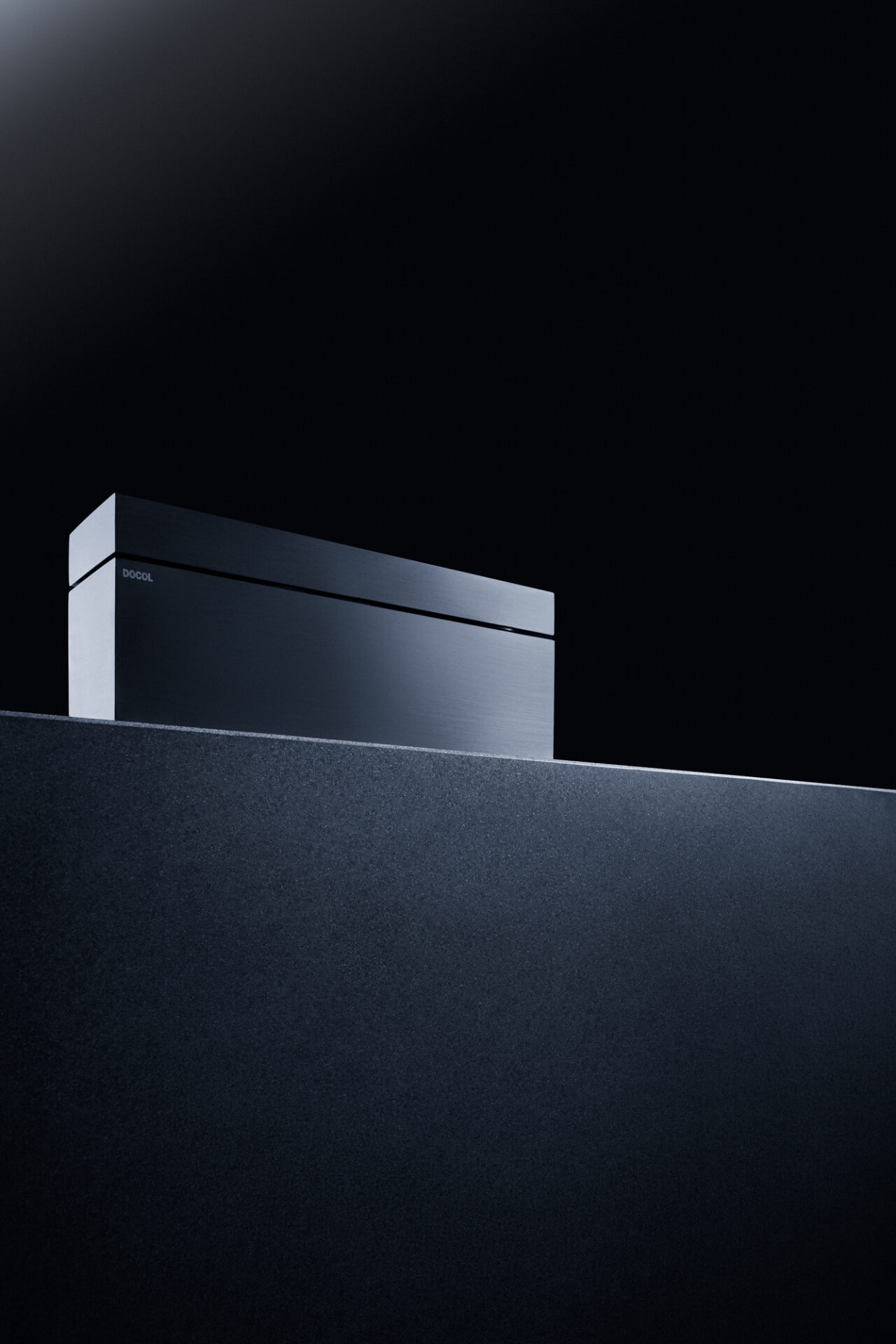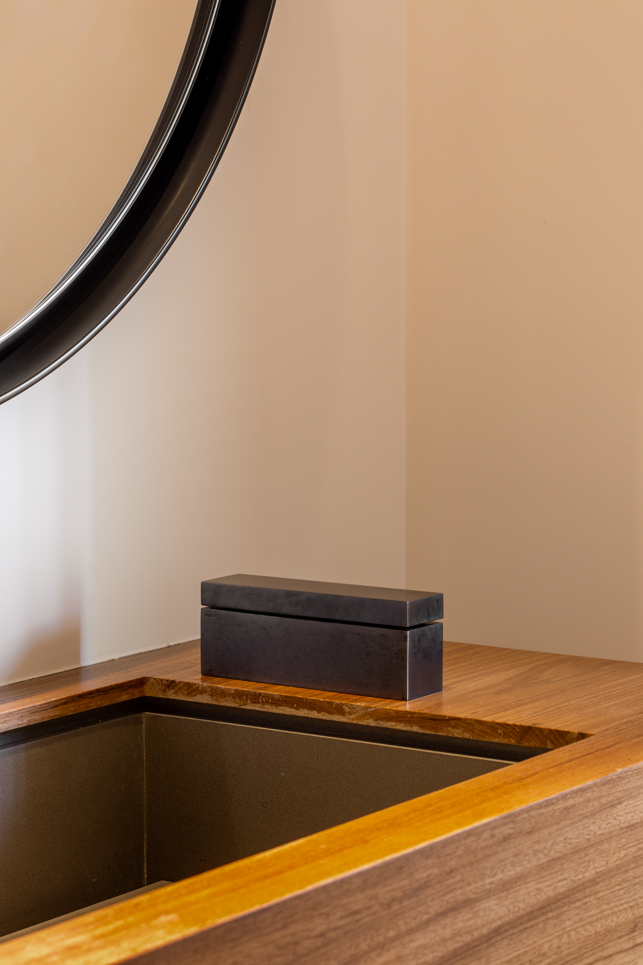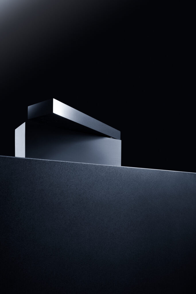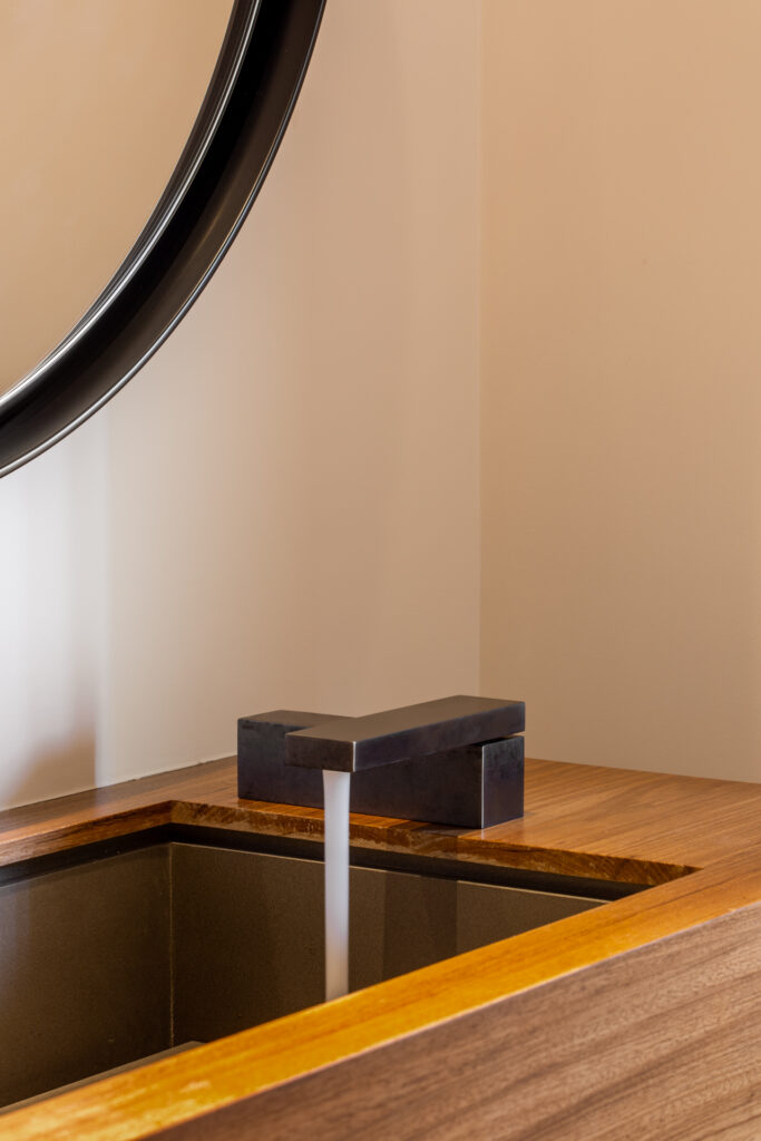 Sendo assim, a ideia deste desenho parte de uma desconstrução do objeto, formado a partir de um desejo de simplificação máxima da forma, a qual é, ao fim, um monolito preto escovado, um pequeno pavilhão que, implantado em uma bancada, pudesse brincar com o imaginário das pessoas. Sutilmente seccionado, o bloco possui um eixo articulador em uma das suas extremidades que permite o movimento e a consequente surpresa da caída da água em 1/4 do giro, travando a abertura em noventa graus, em um ”L” momentâneo.