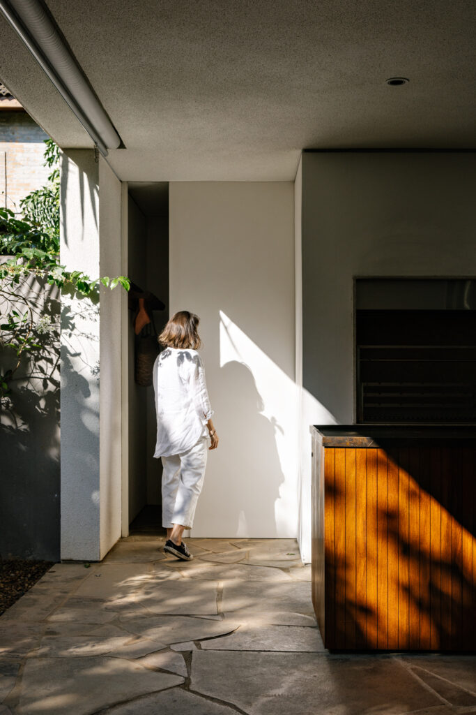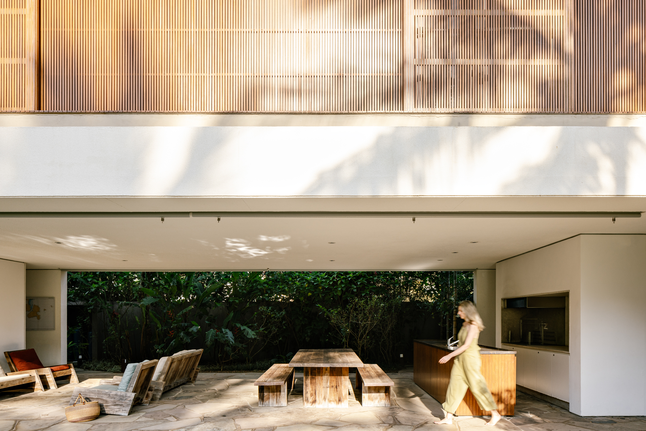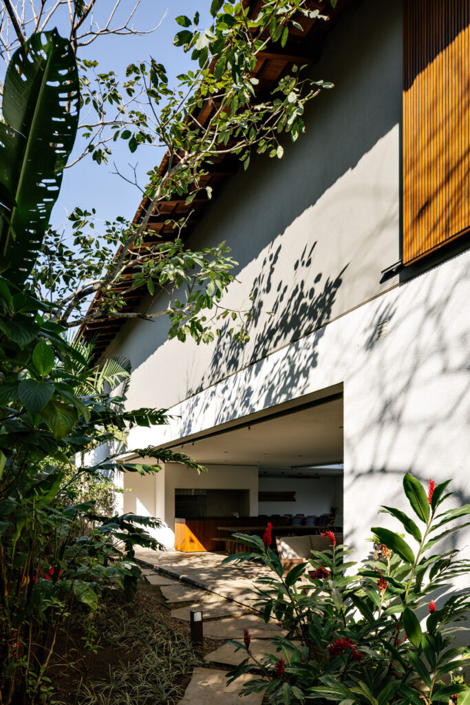 Ainda que aberta para a via de pedestres, a casa busca privacidade por conta do constante fluxo de moradores do condomínio que por ali caminham e, através de uma vegetação alta e seteiras nas faces leste e noroeste, a residência se fecha sutilmente, trazendo uma luz difusa e interessante para a sala de estar.
