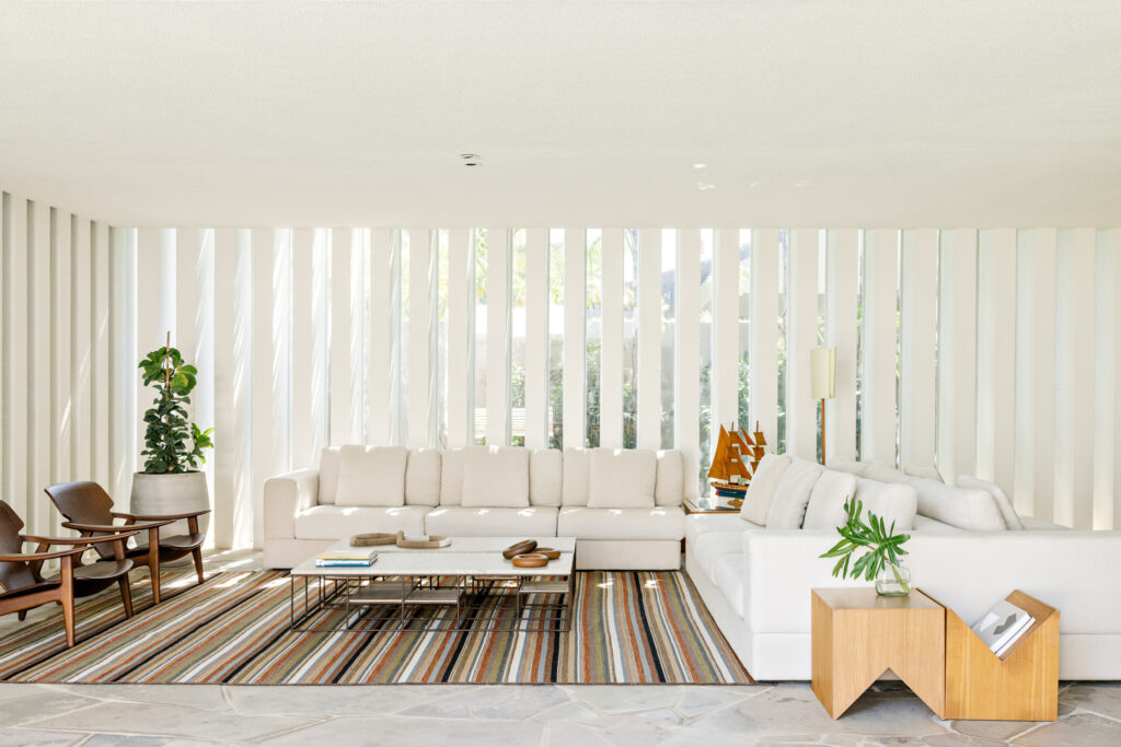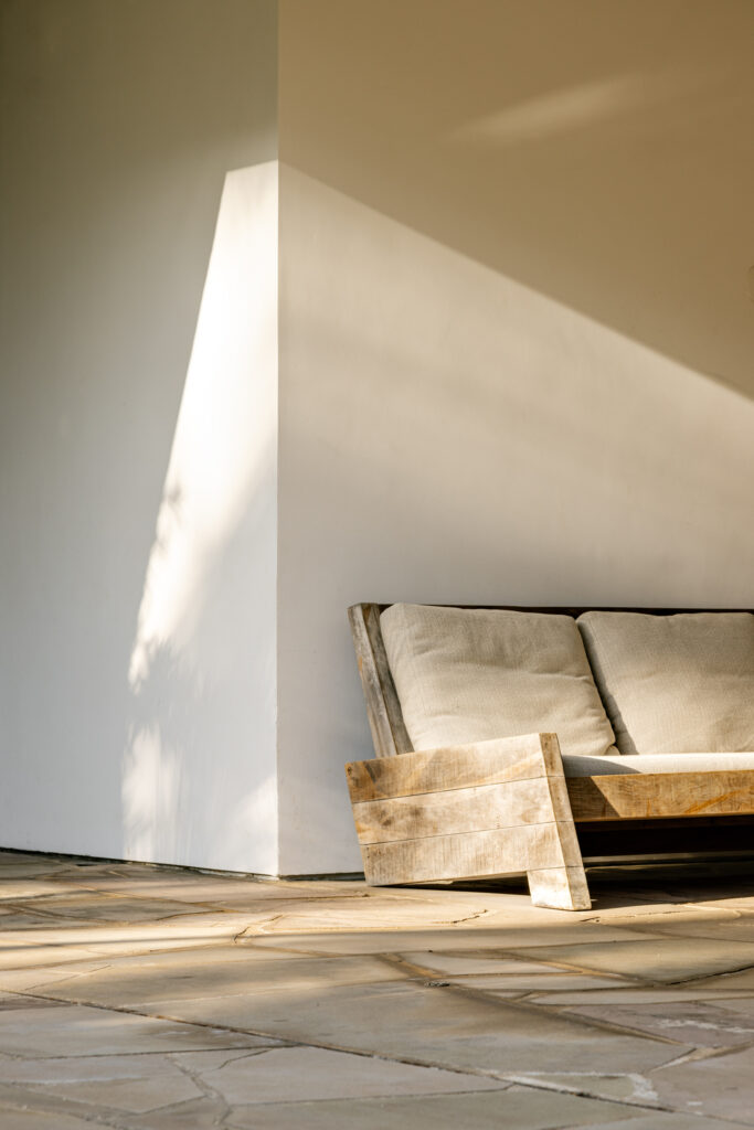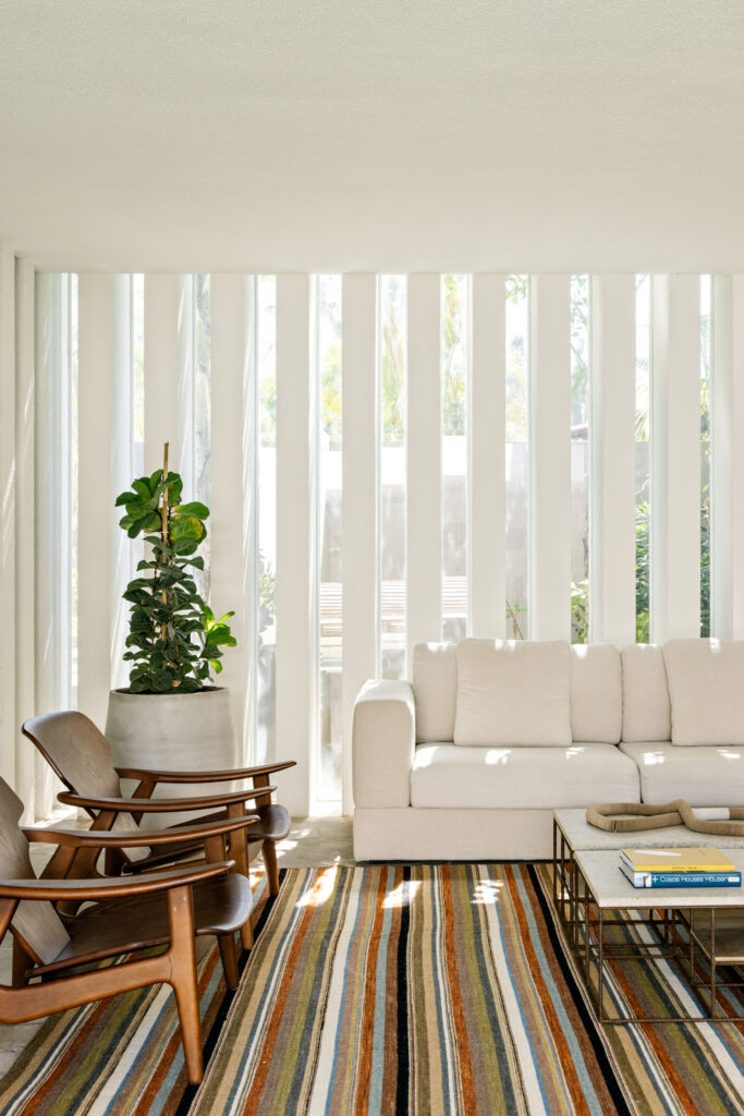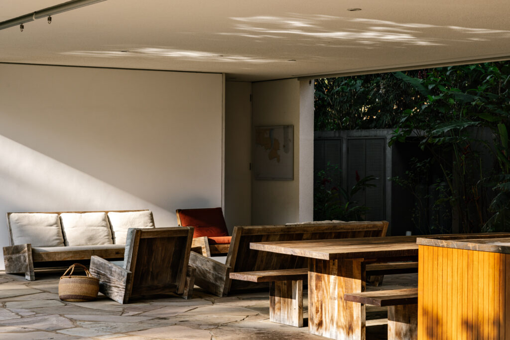Em uma triangulação de uso das áreas do térreo, todos os espaços são integrados e estimulam uma convivência próxima, além da busca do aconchego por meio de cores calmas e materiais que conversam com o clima litorâneo, como o uso de um piso em basalto orgânico, paredes com pinturas texturizadas na cor branca e mobiliário em madeira.