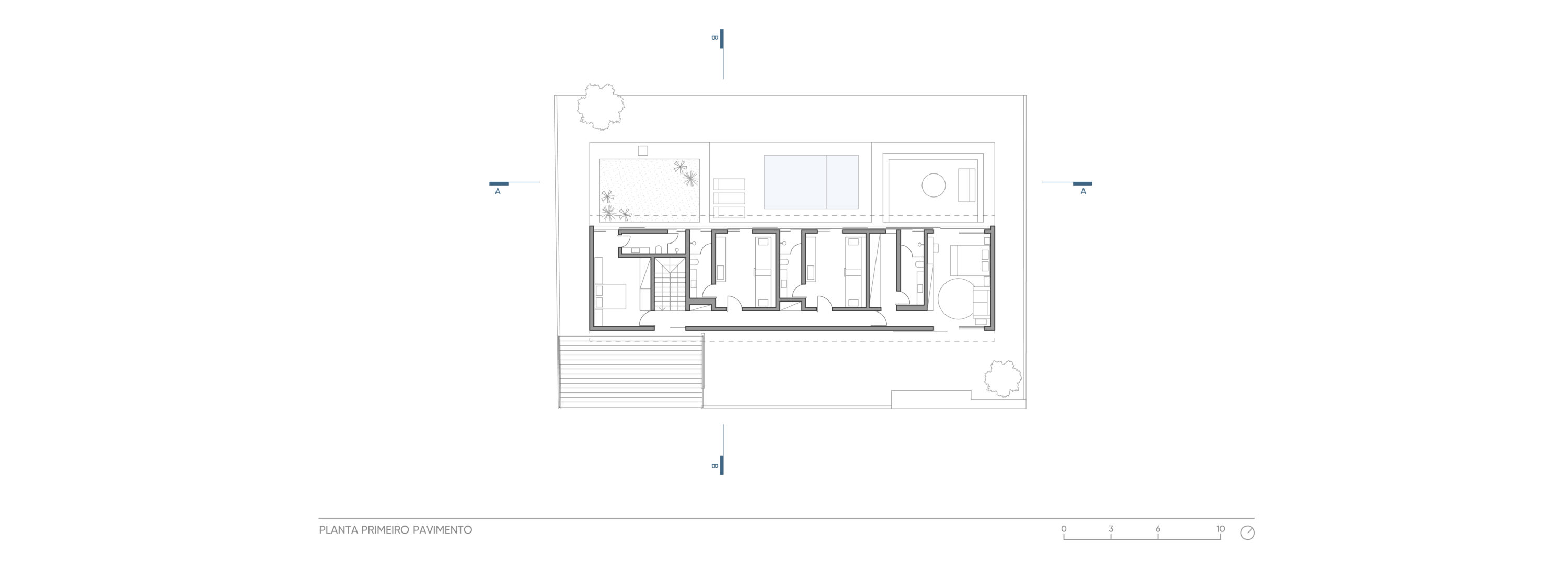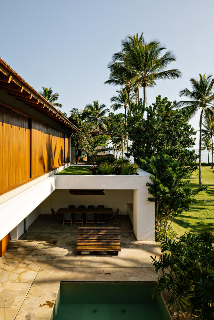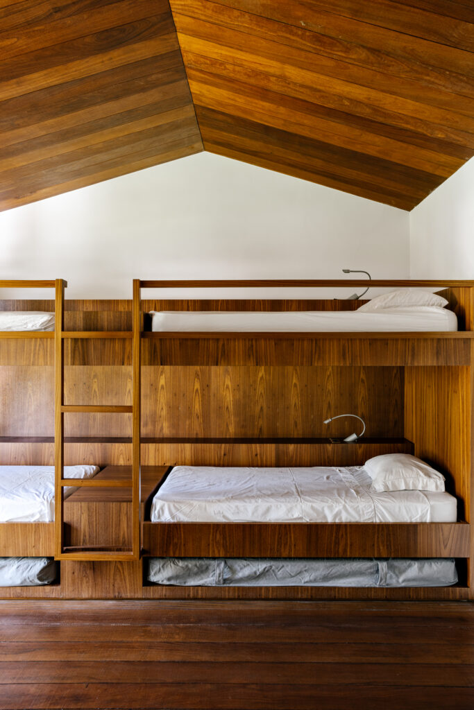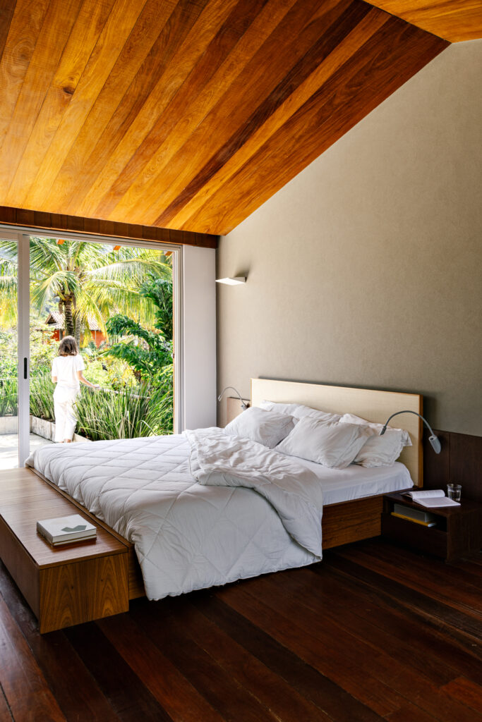 No volume superior, apoiado somente no sentido longitudinal do térreo, foram idealizados ambientes ainda mais introspectivos e aconchegantes. Revestido em madeira em sua face norte, a qual entra também para a circulação de acesso dos dormitórios, o bloco se destaca naturalmente do térreo. Nas extremidades, o espaço livre abre caminho para dois terraços verdes e uma área descoberta que dá vista para o mar de Guaecá.