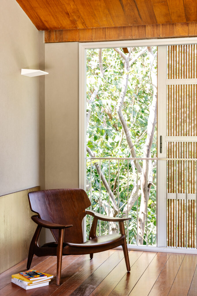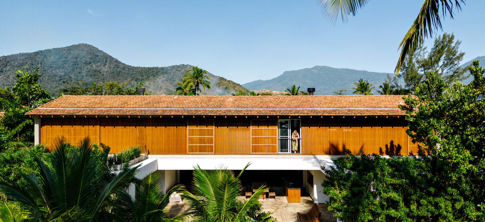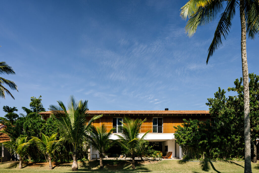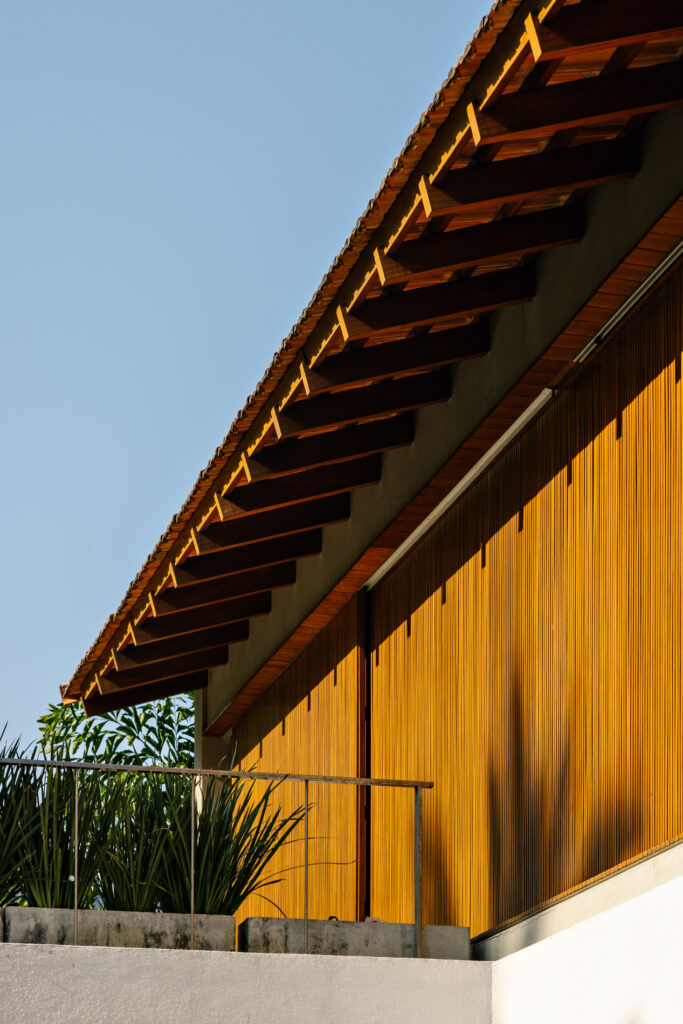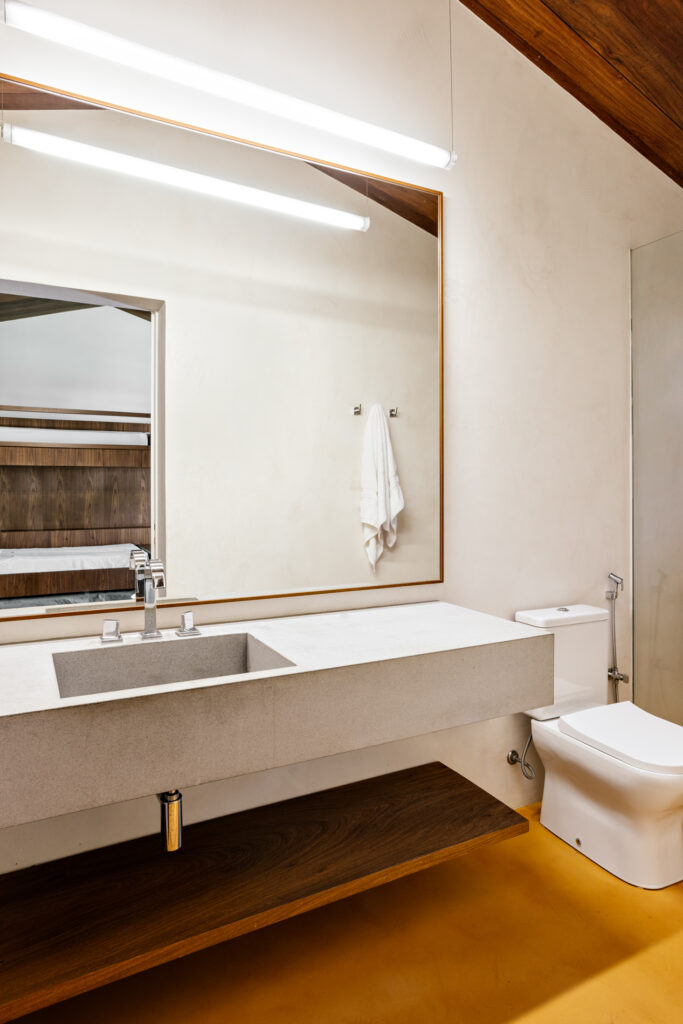 No volume superior, apoiado somente no sentido longitudinal do térreo, foram idealizados ambientes ainda mais introspectivos e aconchegantes. Revestido em madeira em sua face norte, a qual entra também para a circulação de acesso dos dormitórios, o bloco se destaca naturalmente do térreo. Nas extremidades, o espaço livre abre caminho para dois terraços verdes e uma área descoberta que dá vista para o mar de Guaecá.