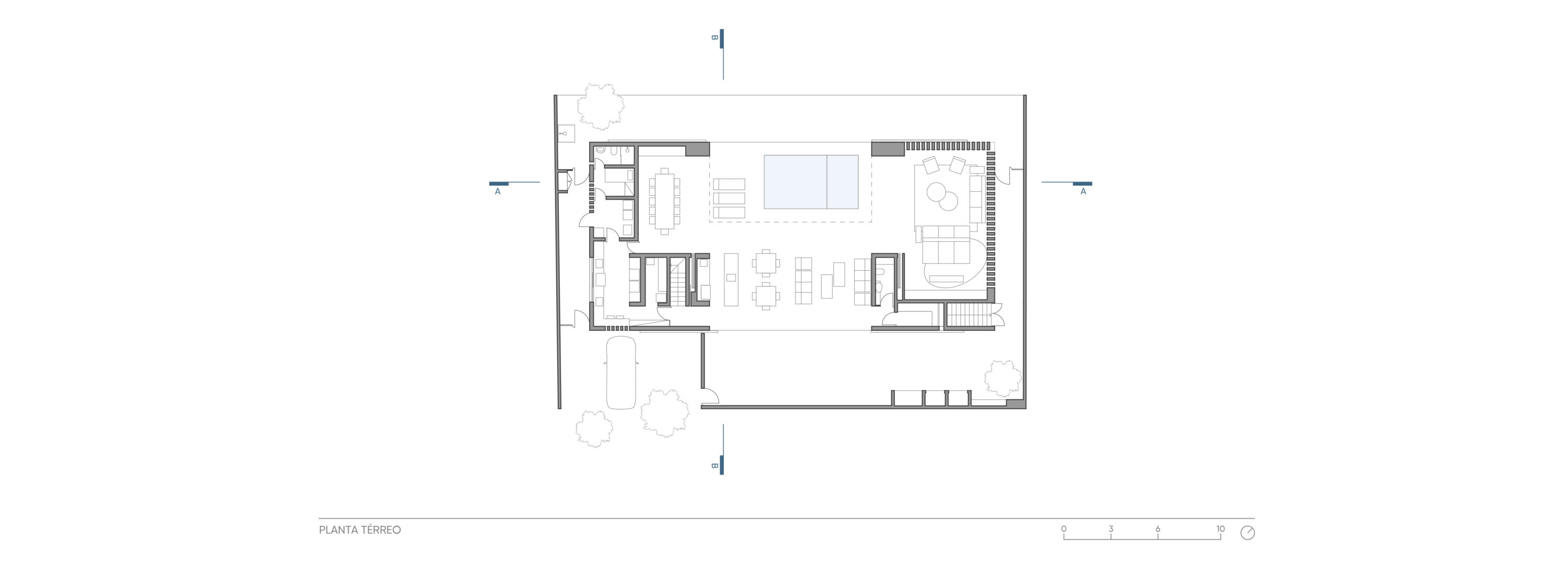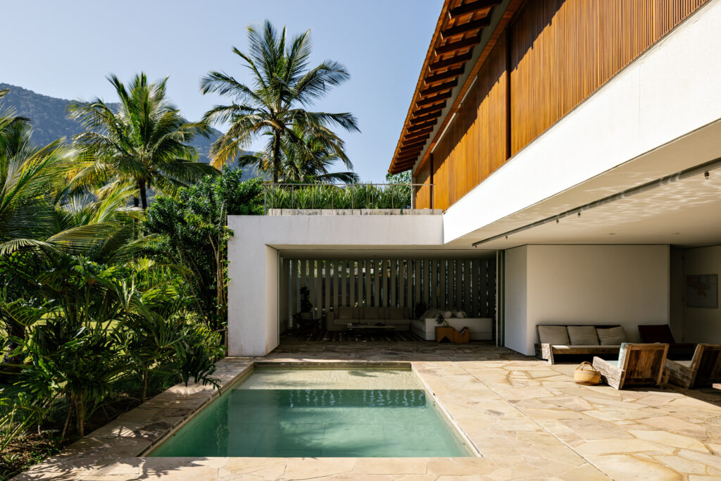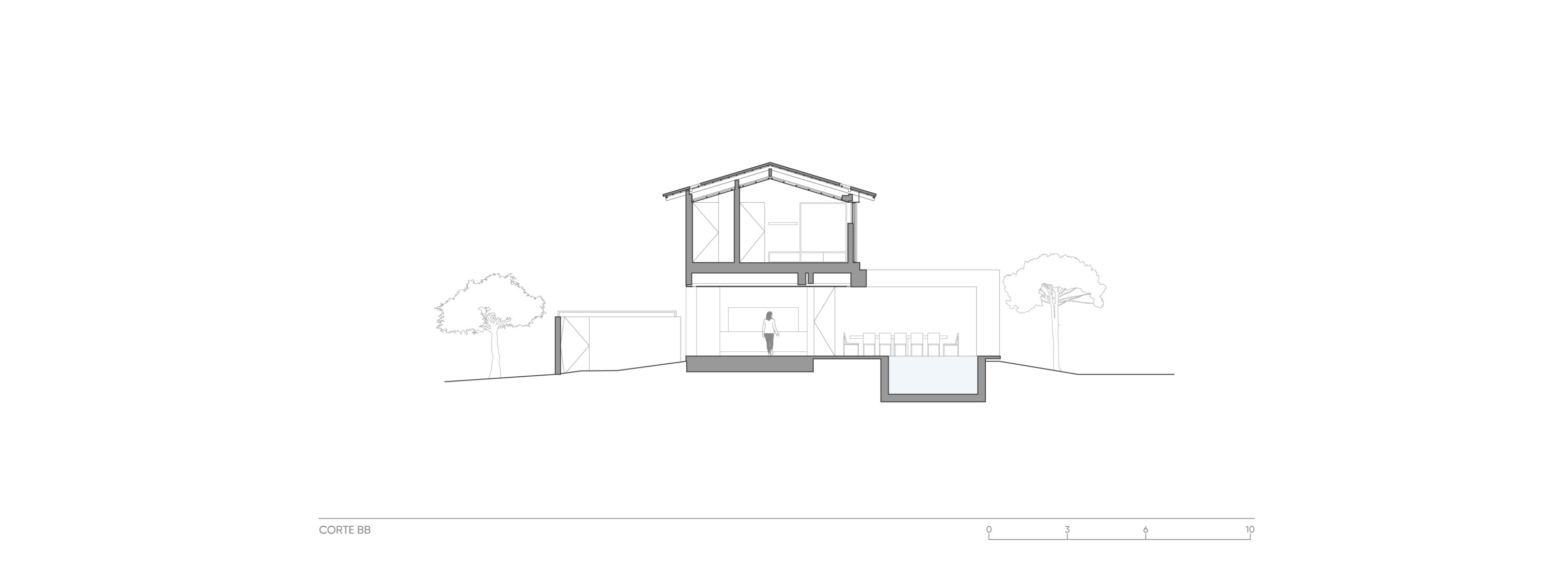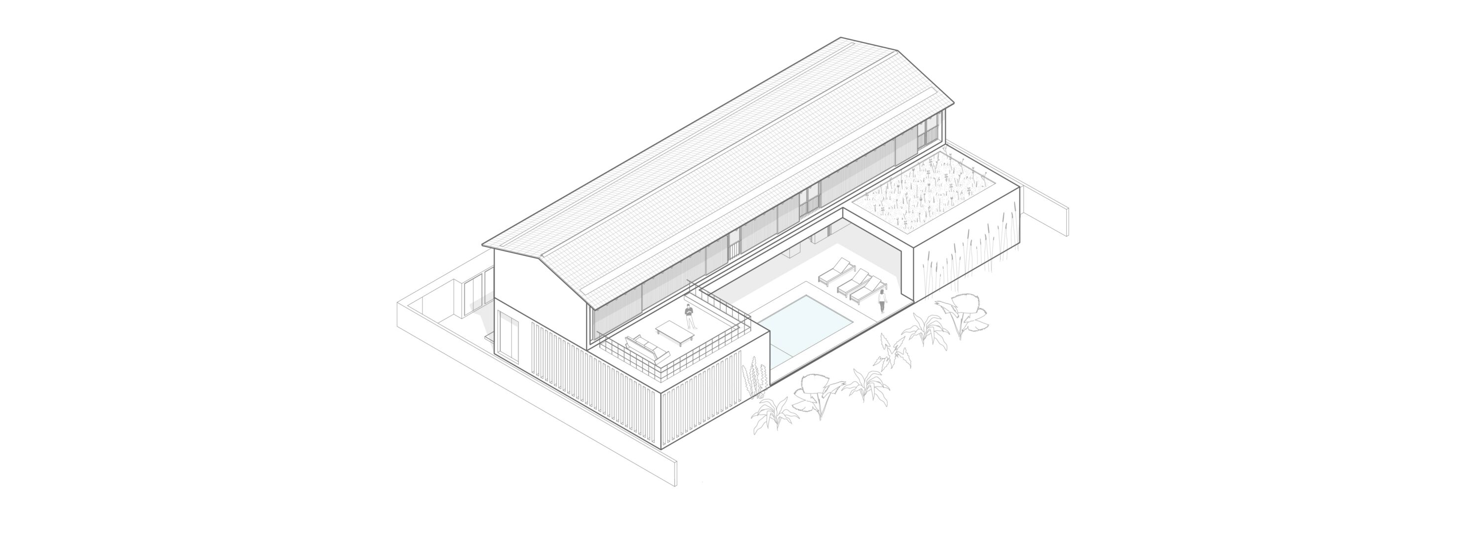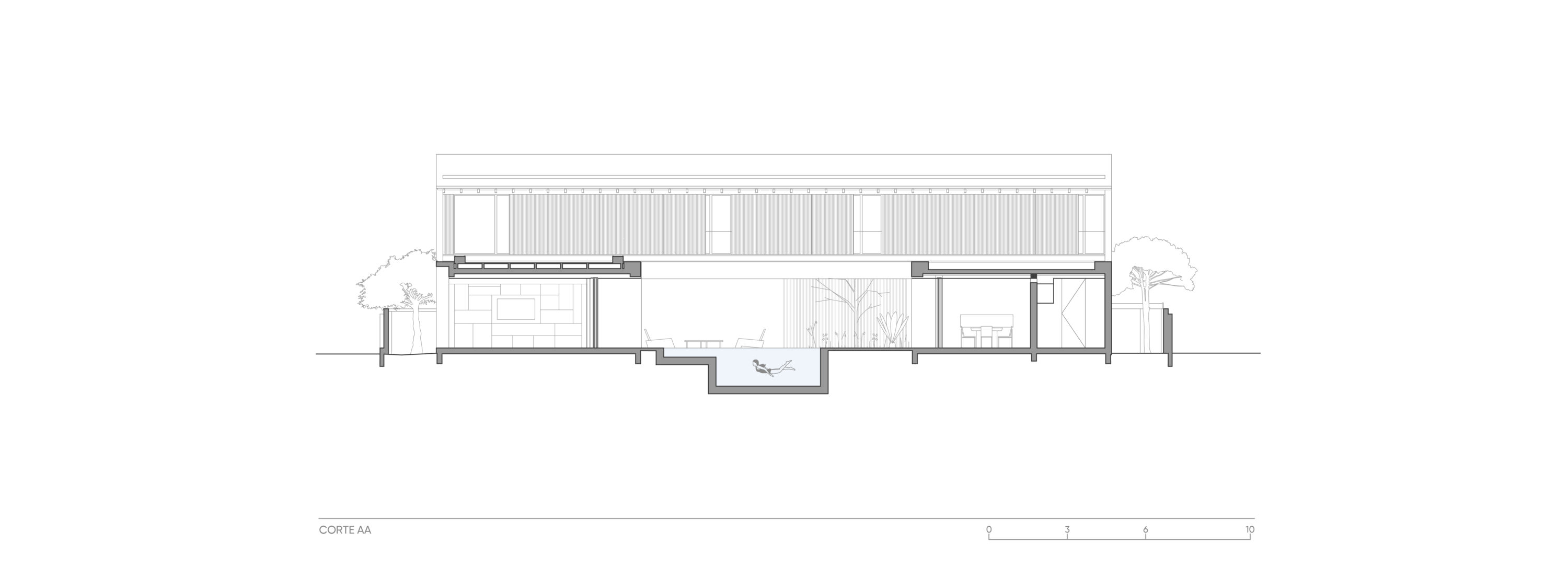 Localizada dentro de um condomínio e entre duas vias de acesso, uma para os veículos e outra para pedestres, a casa-varanda de implantação ”U” se abre discretamente para o gramado e palmeiras, enquadrando-os e colocando em seu centro uma piscina. Protagonizando a área social no térreo, o projeto organiza os dormitórios na lâmina do pavimento superior.