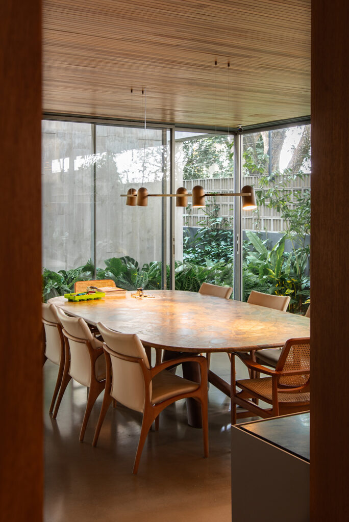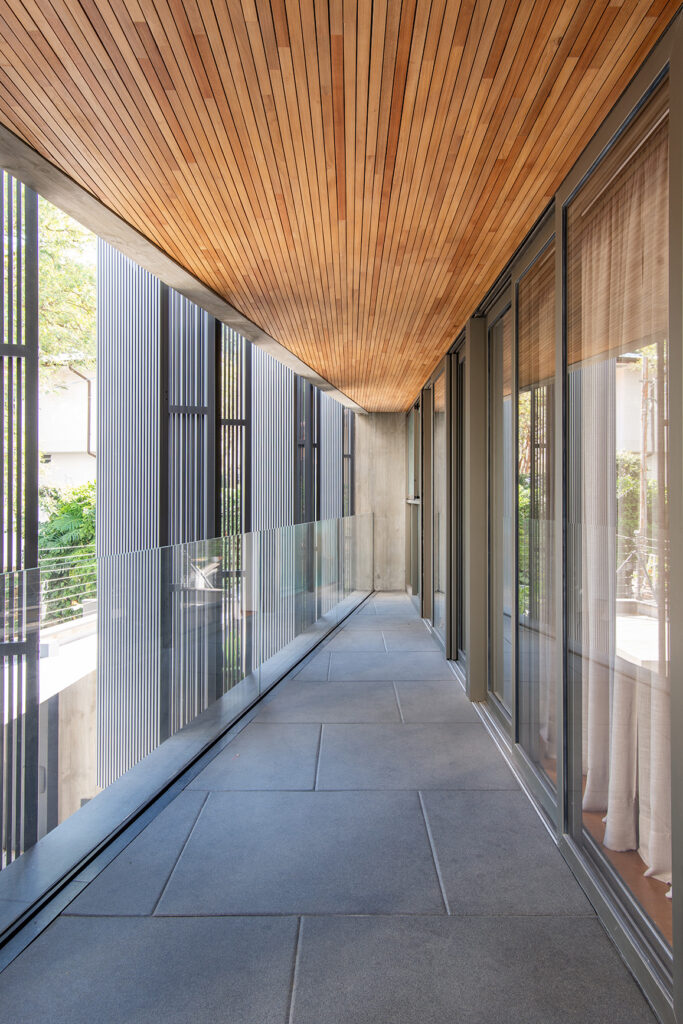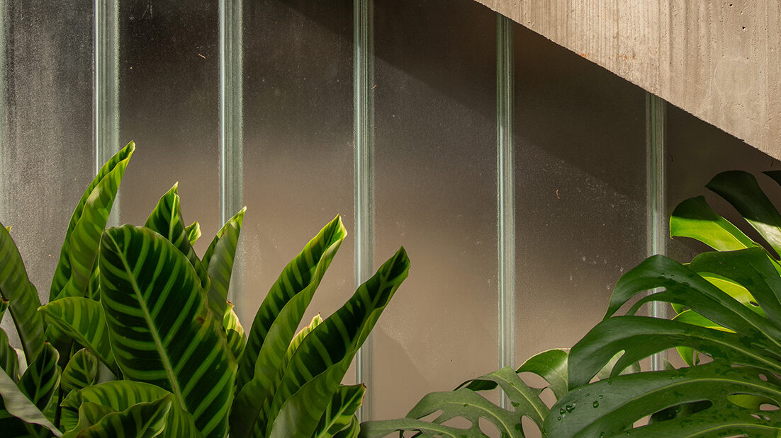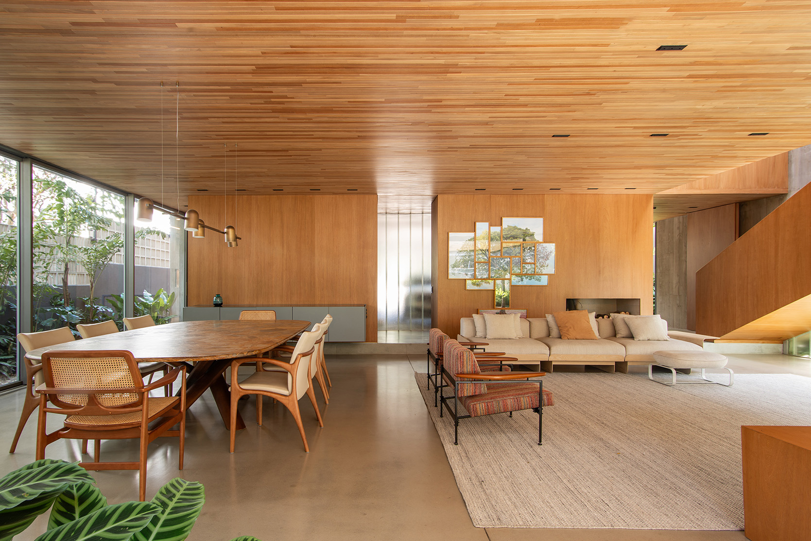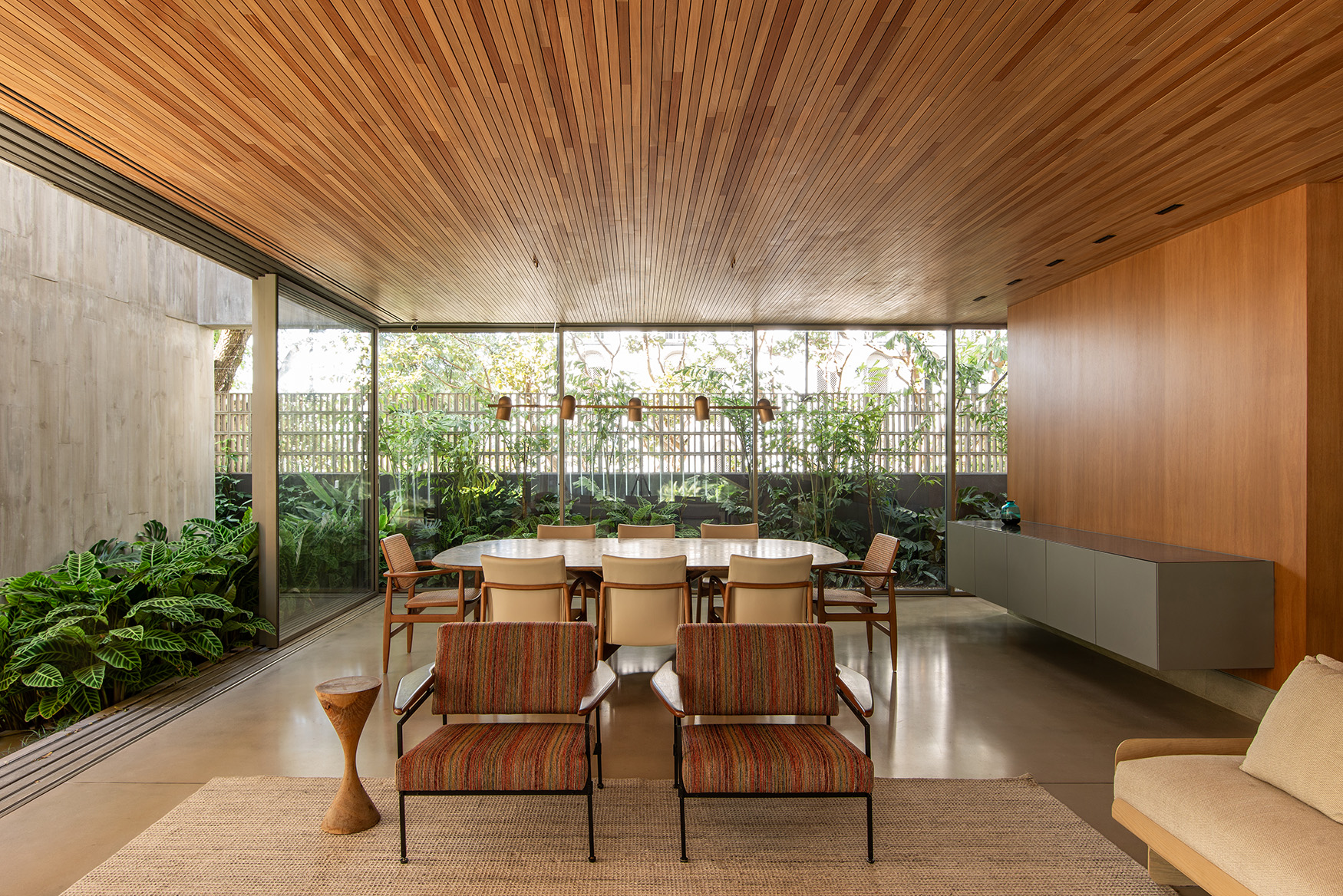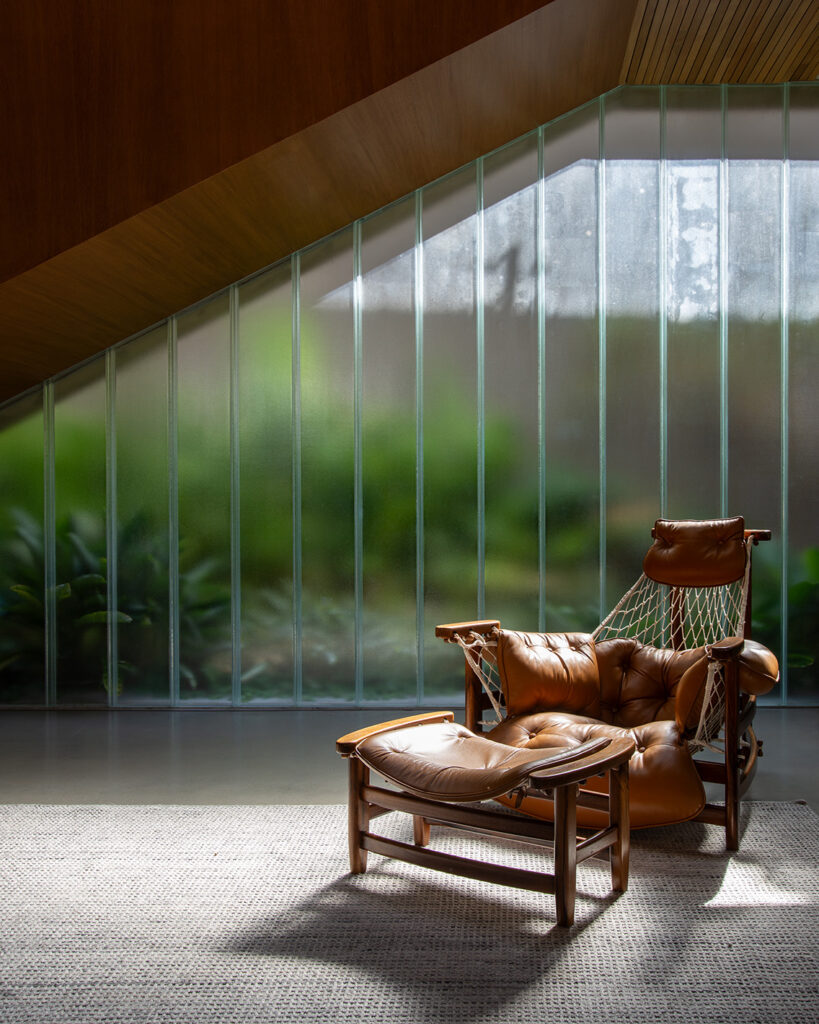 Como numa brincadeira com a rigidez do concreto e o ensaio de uma área social muito integrada, uma das fachadas laterais desce em uma diagonal rumo ao piso – uma tentativa de um delicado gesto – que na verdade esconde uma fundação com características muito específicas, exigidas para suportar a carga do pavimento superior. Para manter a luminosidade e proteger a sala de estar da chuva ou vento, painéis de u-glass foram posicionados em forma negativa ao concreto.