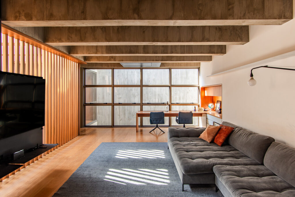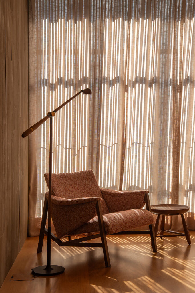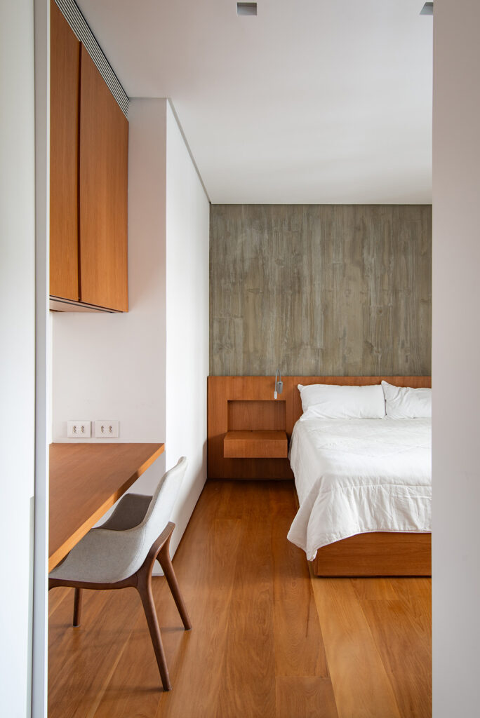 Aparentemente sóbria em seu exterior e de uma certa essência brutalista, internamente ela é abraçada pela madeira, que marca presença em toda a área social, e se dilui, aos poucos, para alguns elementos nos dormitórios e áreas mais reservadas.