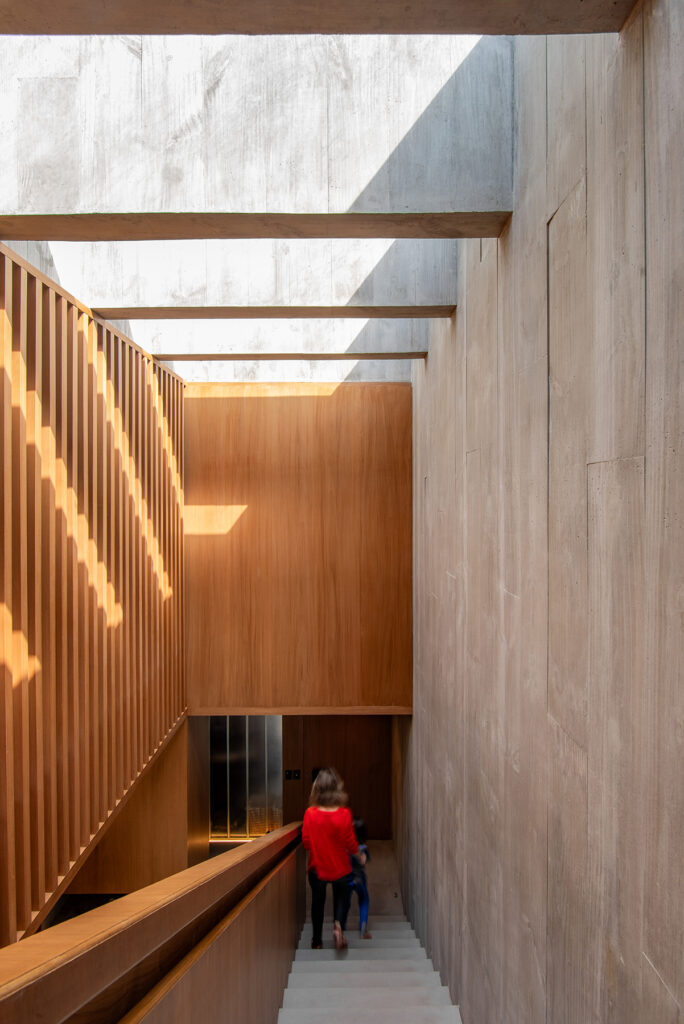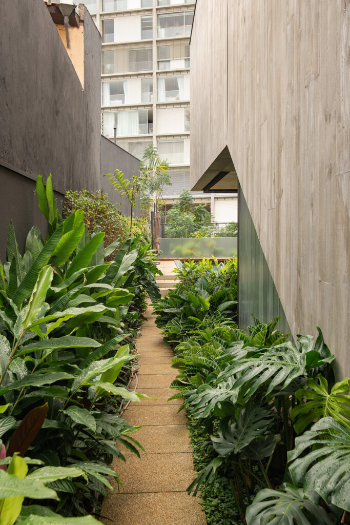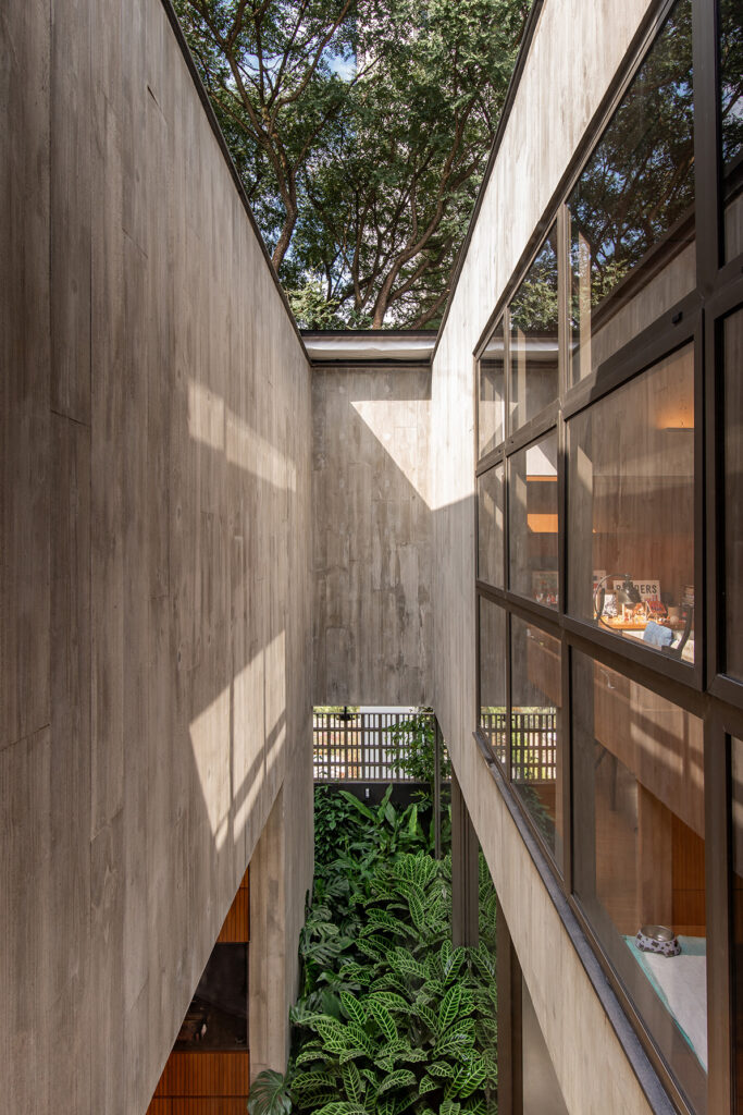 Situada em um terreno de contornos irregulares, a casa na Vila Madalena emerge como um monólito de concreto, que se desfaz à medida que se relaciona com o lote. No pavimento superior, aberturas estratégicas servem aos quartos, tanto na frente quanto nos fundos. No térreo, um movimento ousado da estrutura balanceia a edificação em duas direções, tudo ancorado por uma escada/pilar que transfere, de forma precisa, a carga ao solo.