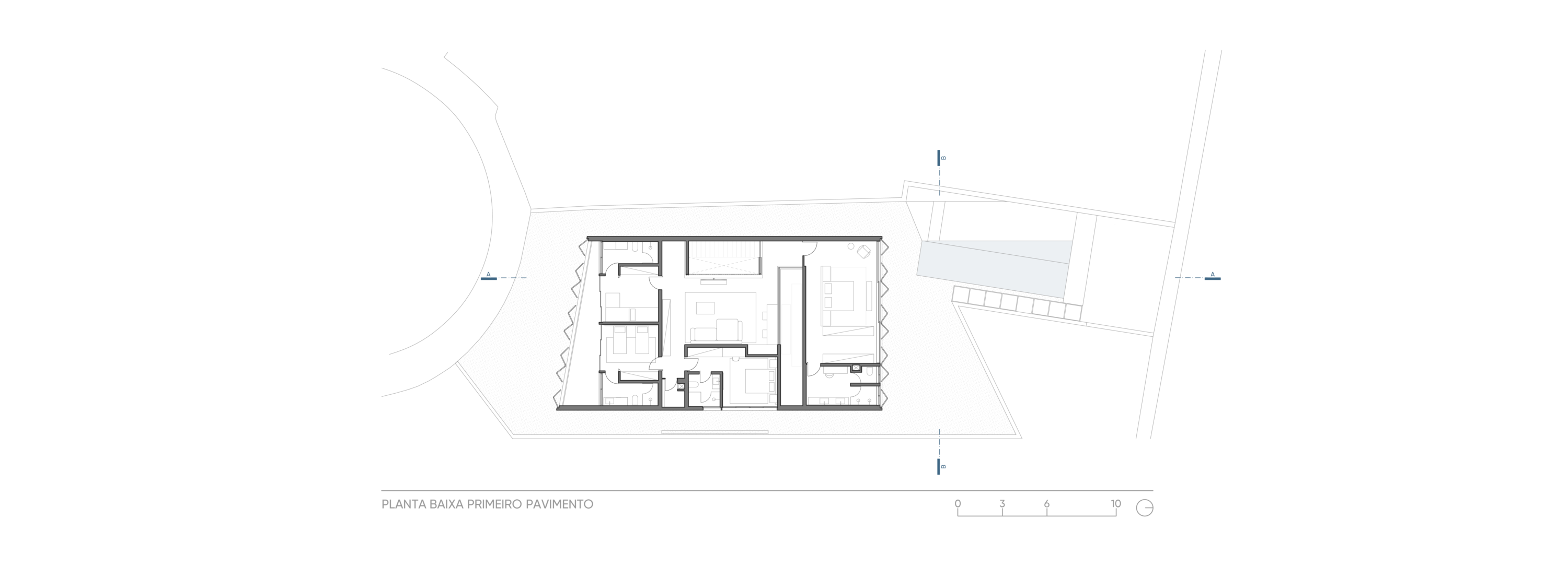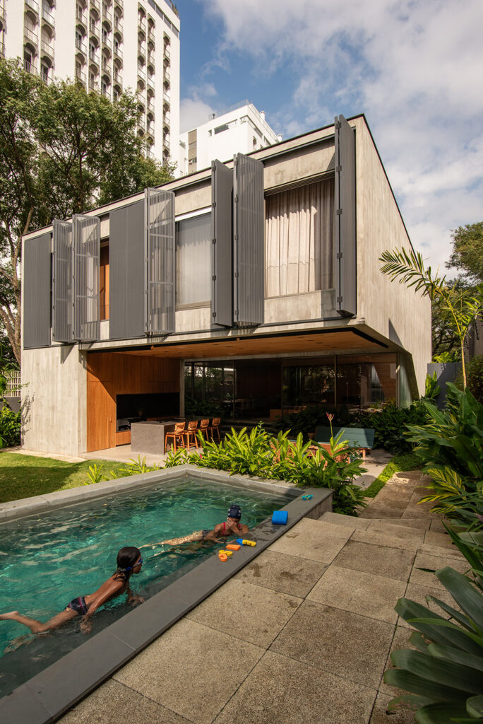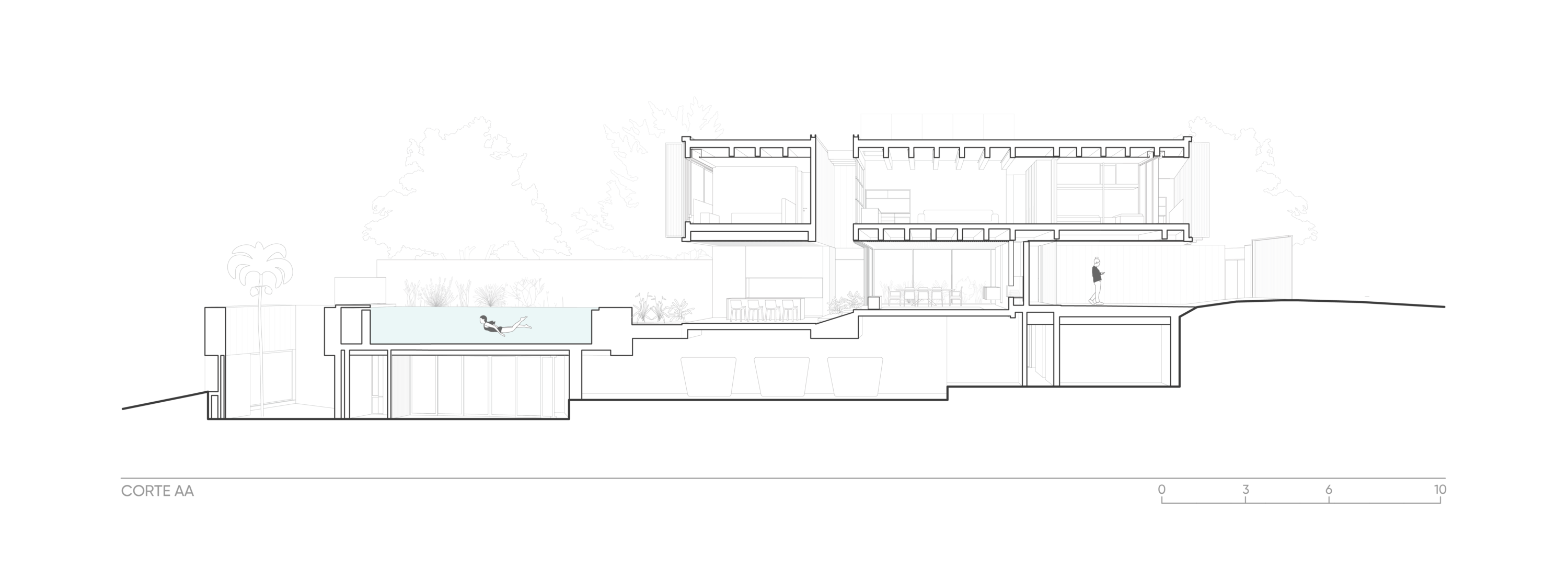 Concebida para uma jovem família, ela surpreende em tamanho, aproveitando do declive para estruturar três níveis de uso: área social e de serviços na cota de acesso, escritório, academia e brinquedoteca na cota mais baixa e, por fim, dormitórios no primeiro andar, oferecendo vista para a copa das árvores e privacidade.