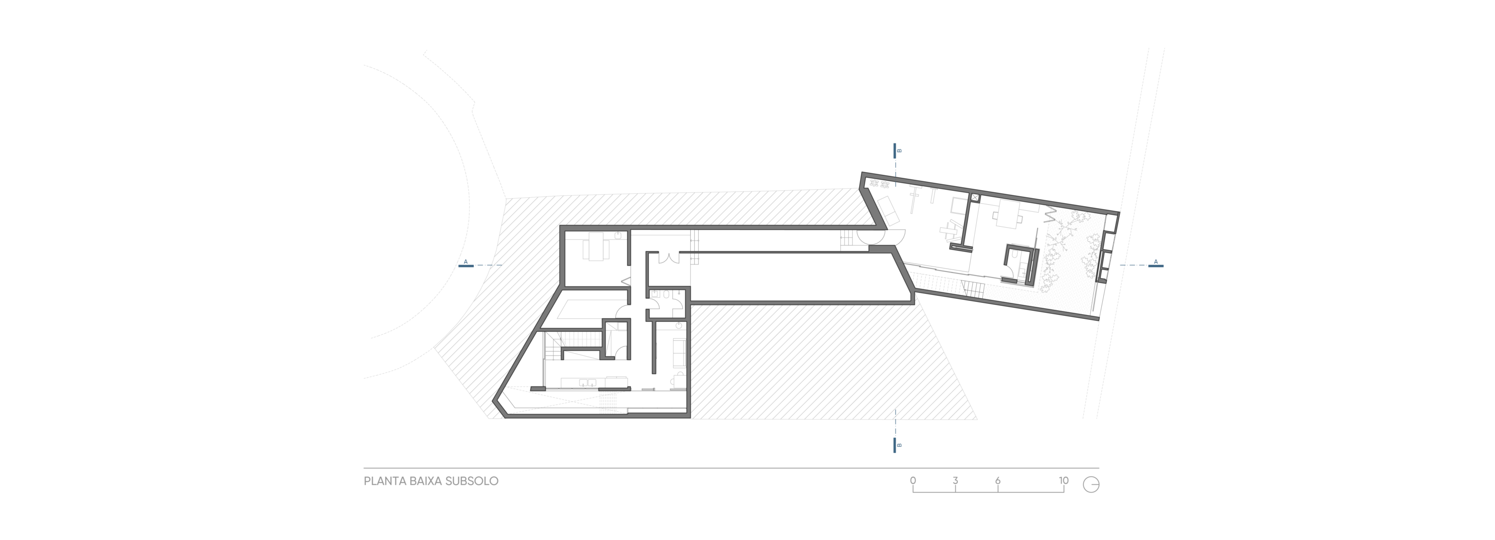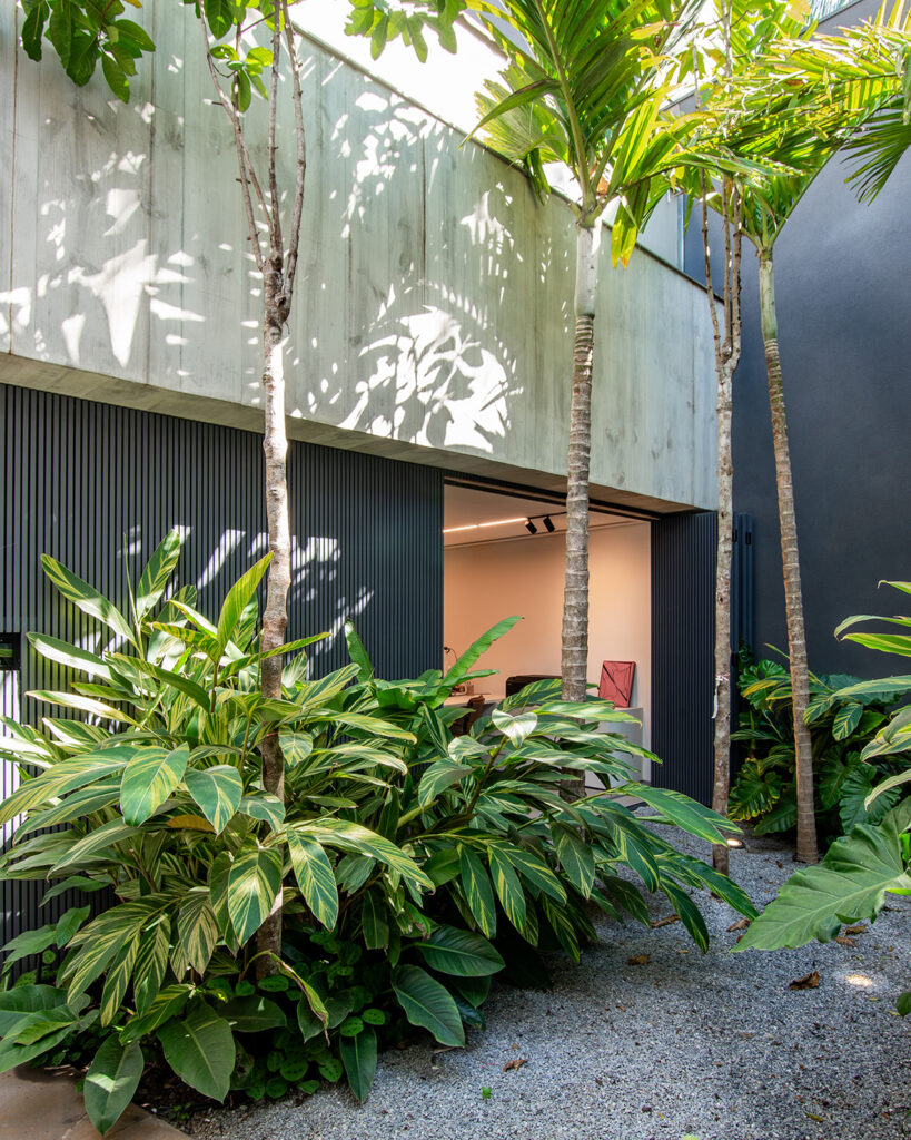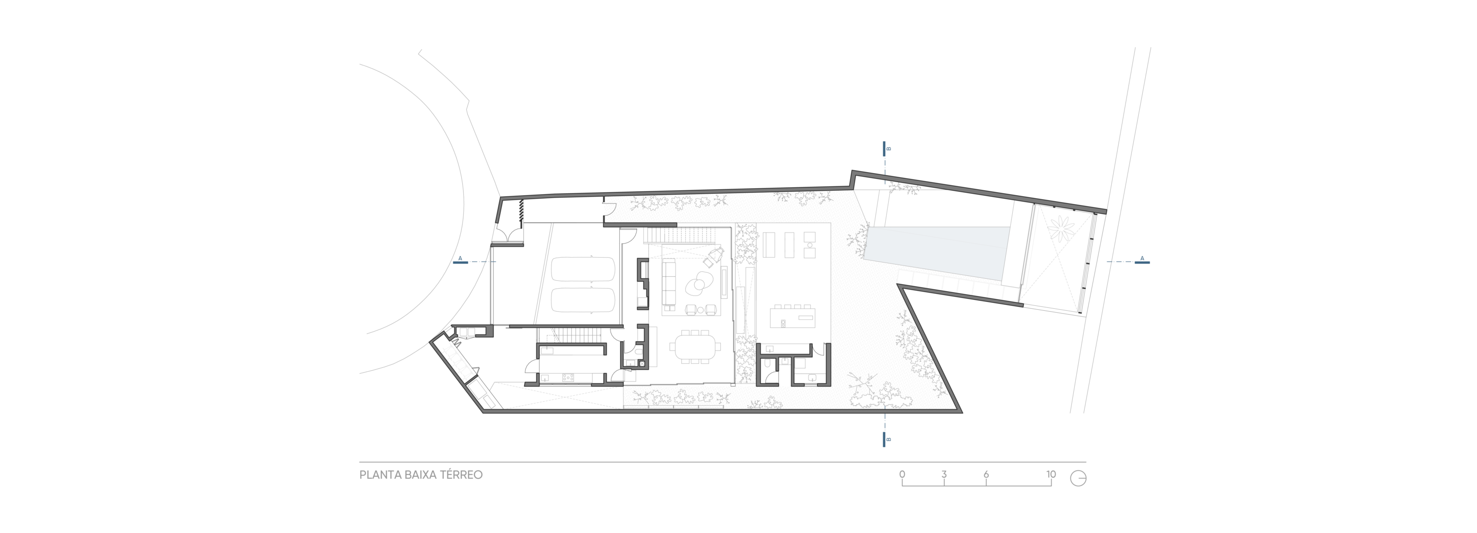 Concebida para uma jovem família, ela surpreende em tamanho, aproveitando do declive para estruturar três níveis de uso: área social e de serviços na cota de acesso, escritório, academia e brinquedoteca na cota mais baixa e, por fim, dormitórios no primeiro andar, oferecendo vista para a copa das árvores e privacidade.