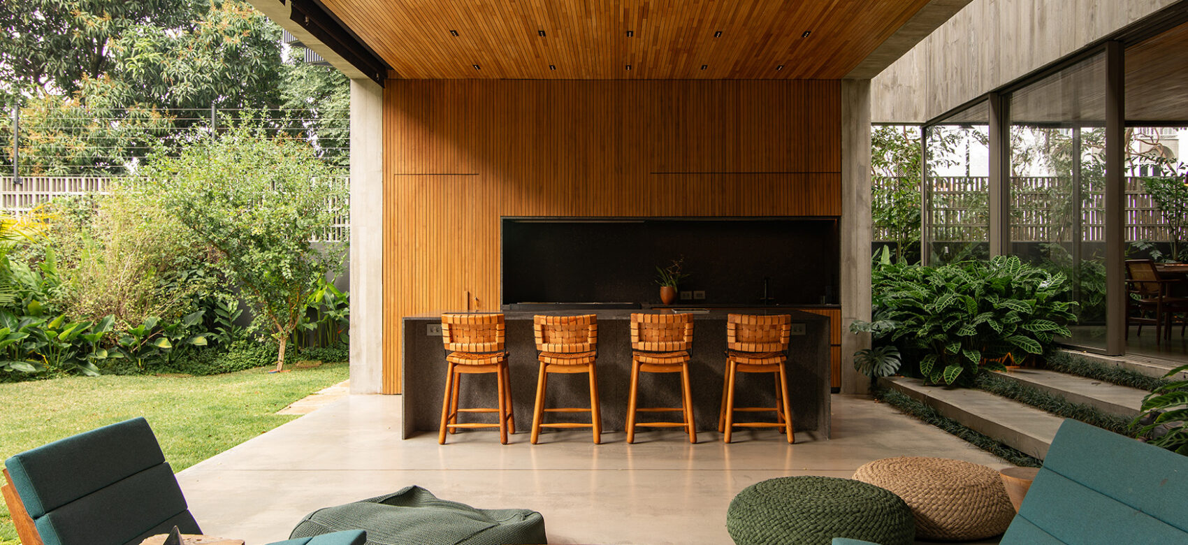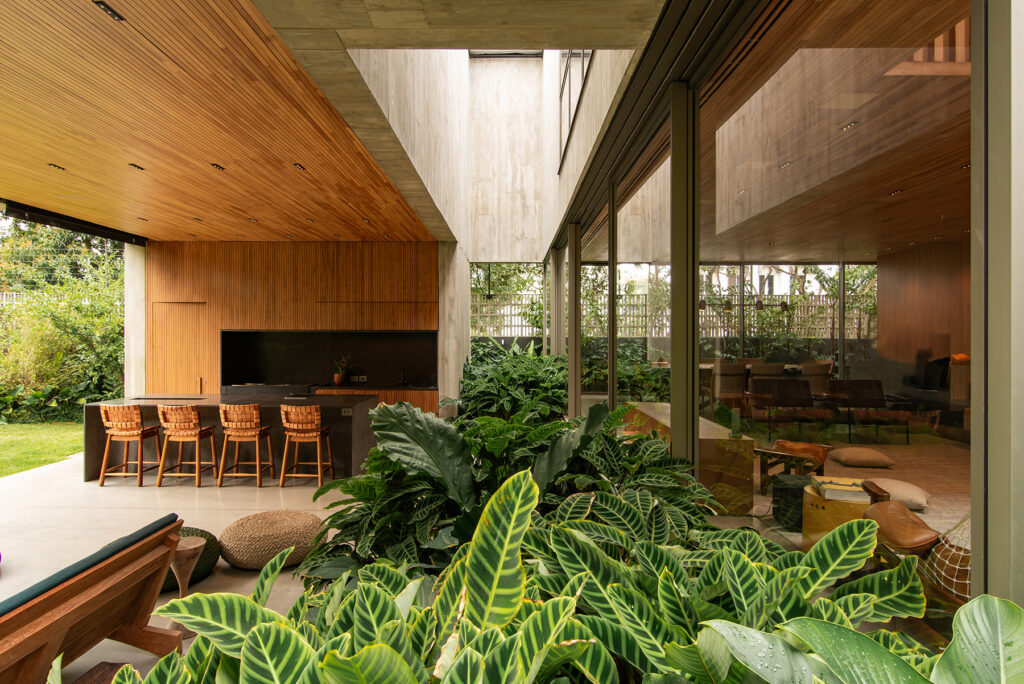 Ao explorar seu interior, a madeira se revela, adornando paredes e tetos. Este teto, ocasionalmente, brilha com luz proveniente de pérgolas ou clarabóias. No espaço do lote, a casa se desdobra: base, sala de estar, varanda e áreas de descanso.